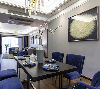 硬裝設計摒棄繁瑣的設計語言,以簡約流暢的設計線條為主,灰藍色的布藝和木質相互映襯,賦予空間優雅含蓄的氣質。