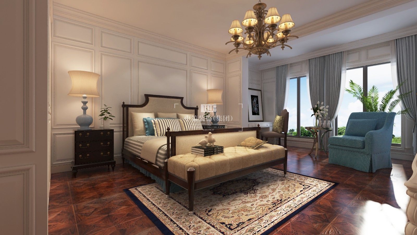本方案以傳統的美式家具搭配白色墻板,給人古典而又溫馨的感覺。