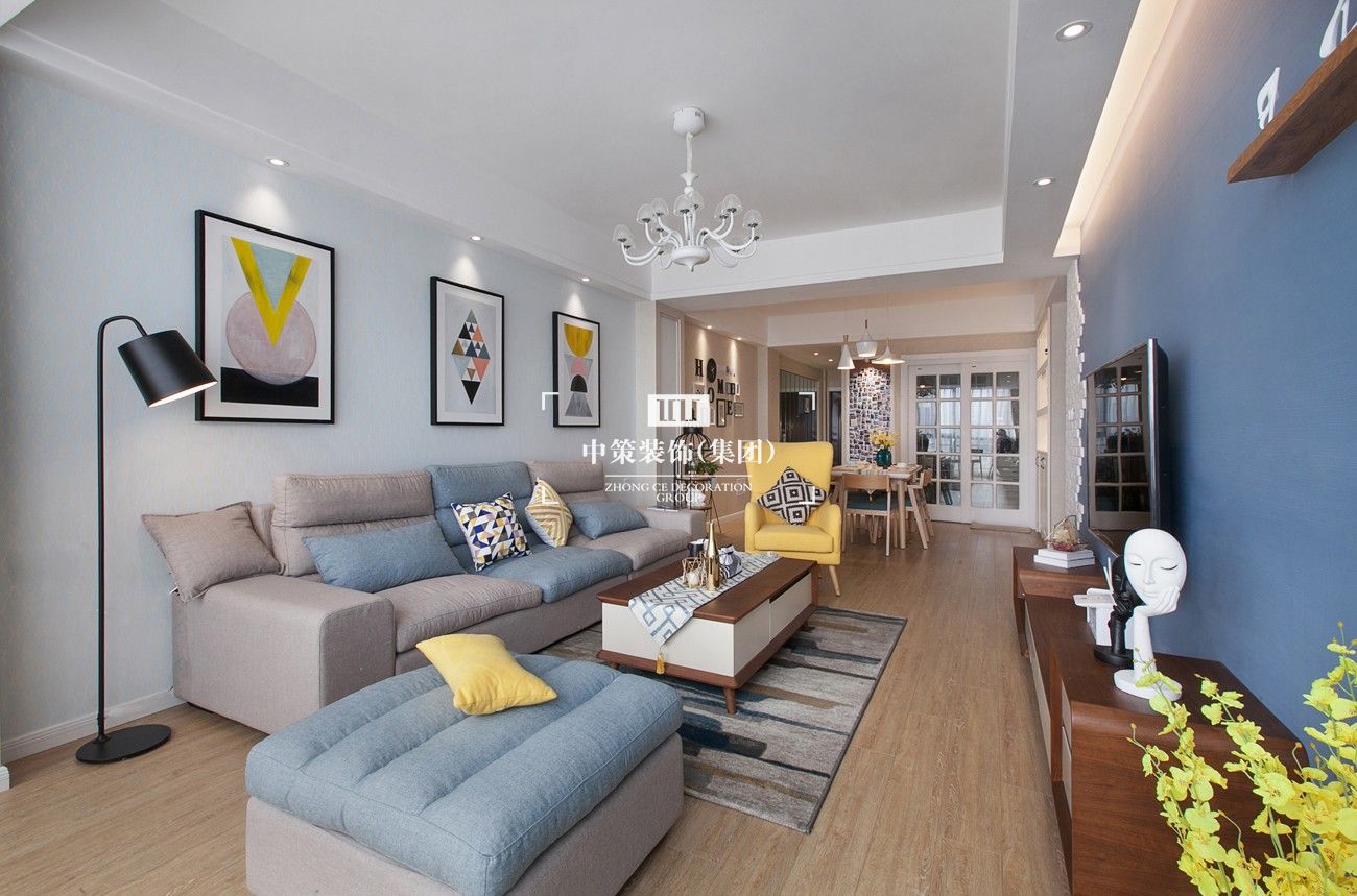 本案為現代簡約風格,在家具和配飾上運用了北歐的元素,增加氛圍感,更溫馨。色彩上主要運用藍色和黃色來提亮空間,細節裝飾上體現了主人對生活的期待和驚喜。